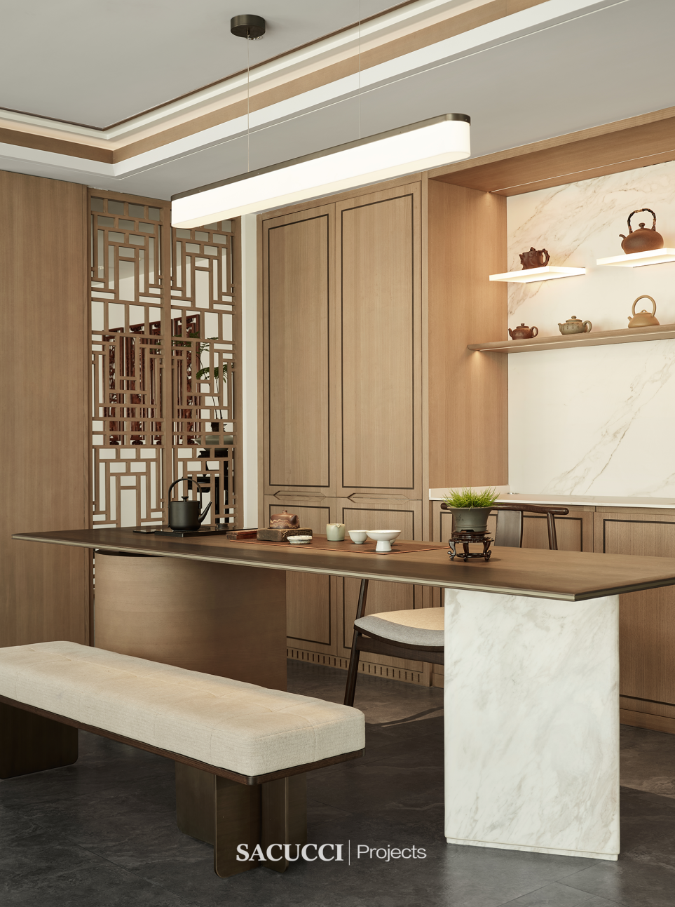 在餐厅的一隅设置主人的品茶区,用以待客或自得其乐。一壶清茶,花枝绿叶,勾勒空间气韵,尽显逸士风骨。