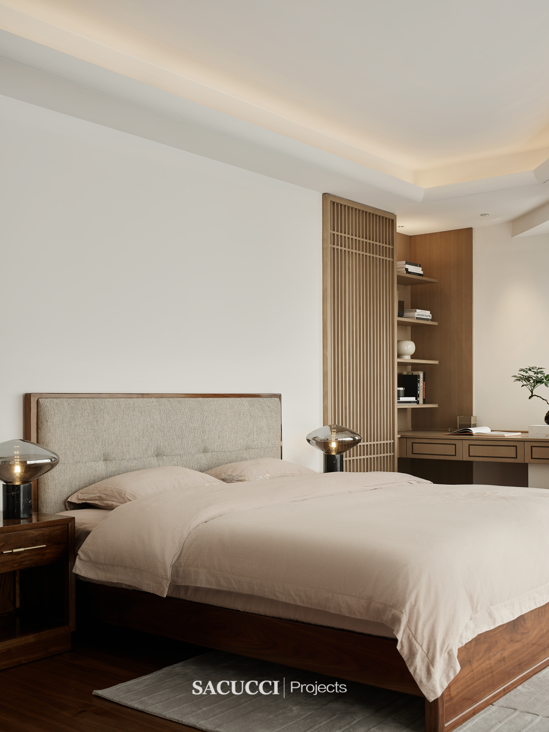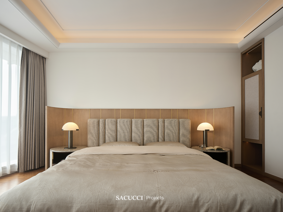 The design of the master bedroom is gentle yet powerful, incorporating wood commonly found in nature to showcase a warm and straightforward aspect of the space. The soft half-circle curvature brings a natural sense of security, while the even and clean wood grain creates a calm and comfortable sleeping atmosphere. Coupled with the absence of an overhead light design, it is pure and elegant.