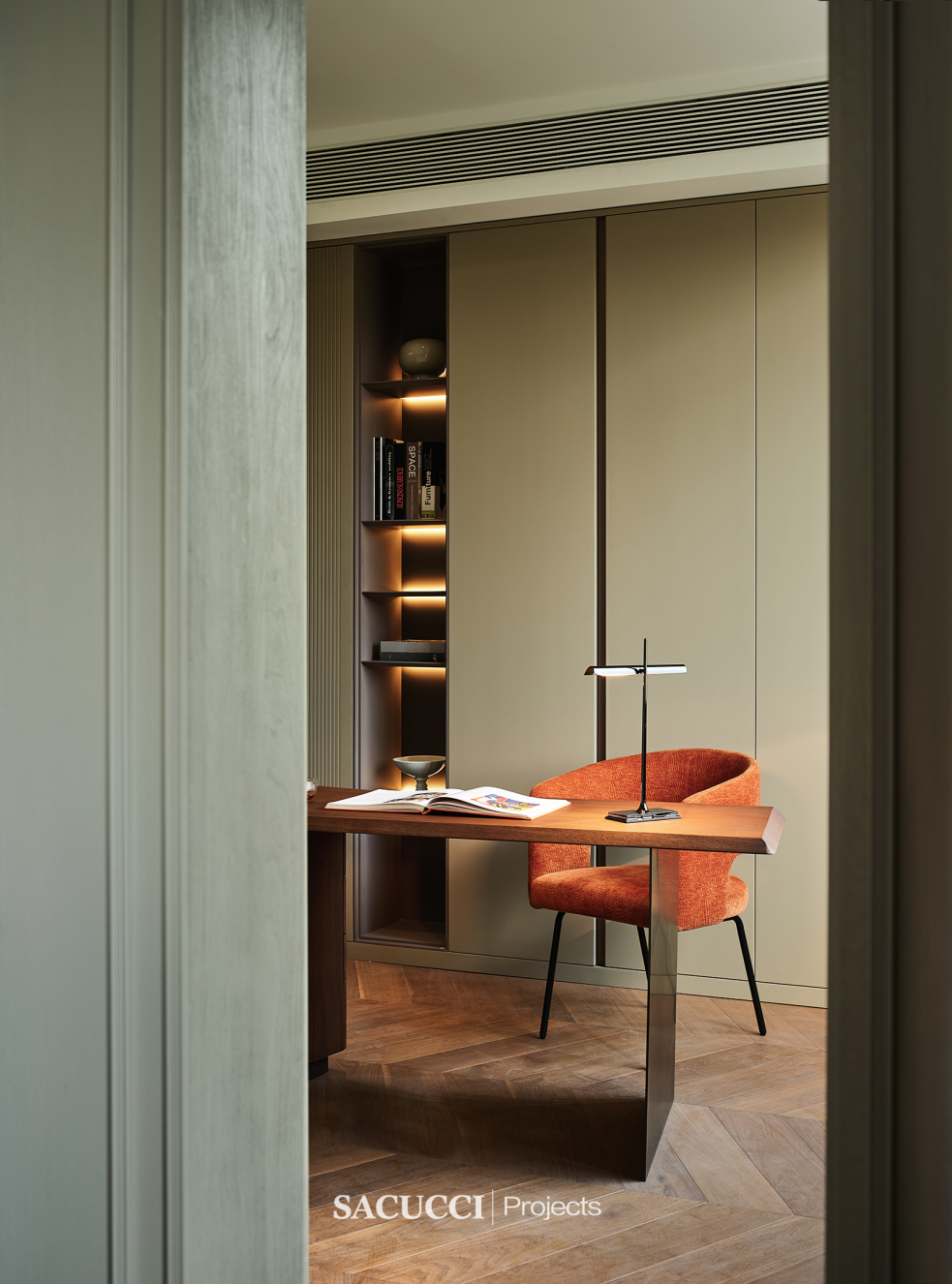 In this case, vividly colored, finely textured rosewood and American cherry wood are used. These woods have uniform structures and excellent resistance to decay, and their straight-grain surfaces alternate between solidity and delicacy, presenting a refined and understated artistic beauty. The unique vegetable oil process pioneered by the Sacucci perfectly enhances the texture of the wood. At the same time, some areas combine with water-based tactile paint technology, harmoniously balancing environmental friendliness with aesthetics, and meticulous attention to detail gives the woodwork lasting vitality.