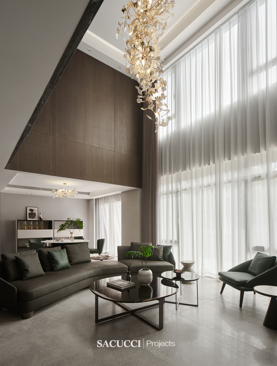 Drawing inspiration from nature, the elegant and refined interior decor exudes a magnificent modern charm. Stepping into the living room, the understated and atmospheric curved sofa complements the entire marble feature wall, while the sunlight streaming through the large floor-to-ceiling windows extends into the room, adding a gentle ambiance. A pendant light crafted from a cluster of ginkgo leaves winds down from the ceiling, creating an even more serene and cozy atmosphere.