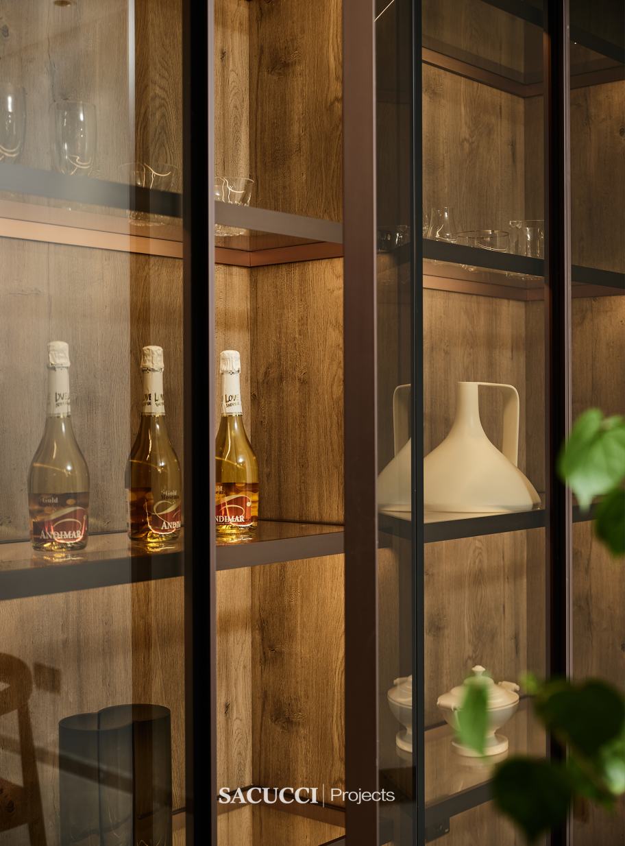 真正的高级感,由内而外,除了茶,主人对于酒也有一种特殊的偏爱,原木墙柜宛如艺术品一般静置于室内,透过明净的玻璃门,主人的藏酒整齐有序地排列着,优雅而不失稳重。