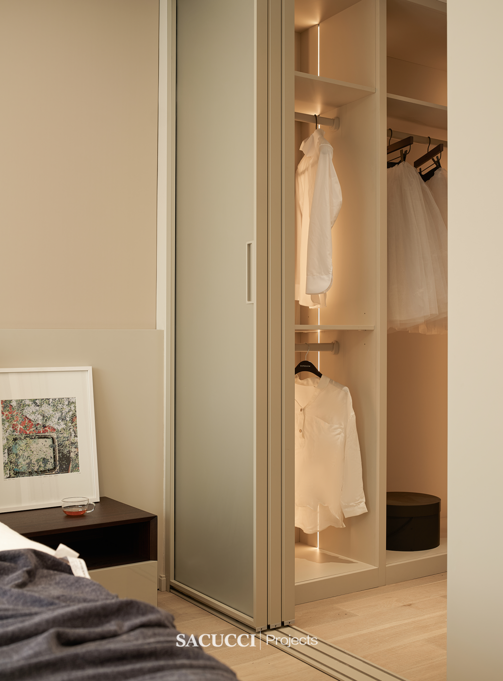 床的一侧设置了小型衣帽间,将贴身衣物收纳其中,简洁而时尚。