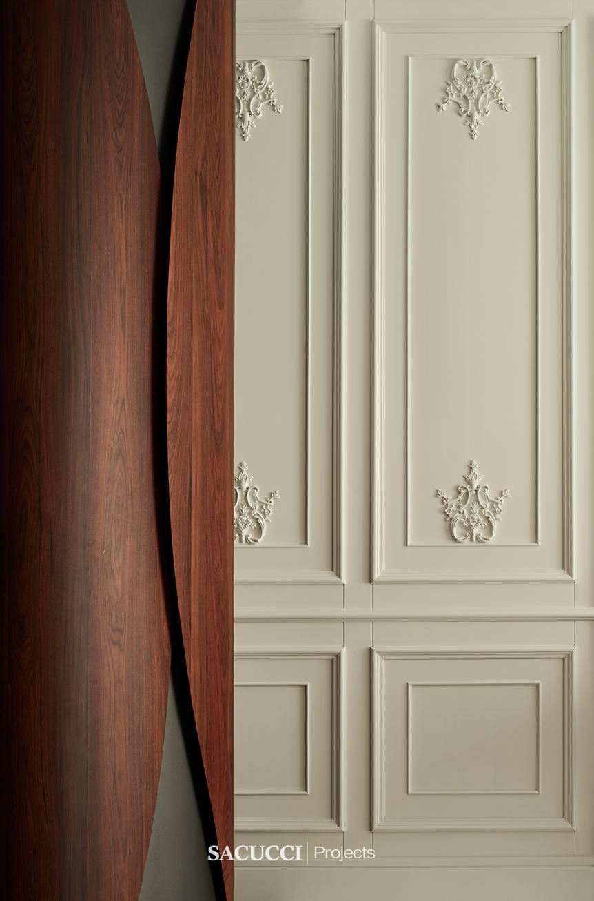 In the bedroom's tranquility, Uruguayan rosewood softly touches the walls with its gentle texture, bringing a sense of closeness to the earth. Italian zero-degree matte paint complements this, adding tranquility and elegance. With unique shapes and smooth lines, the decorative dividing lines and the fusion of rosewood and metal paint resemble twinkling stars in the night sky, injecting unique artistic charm into this space.