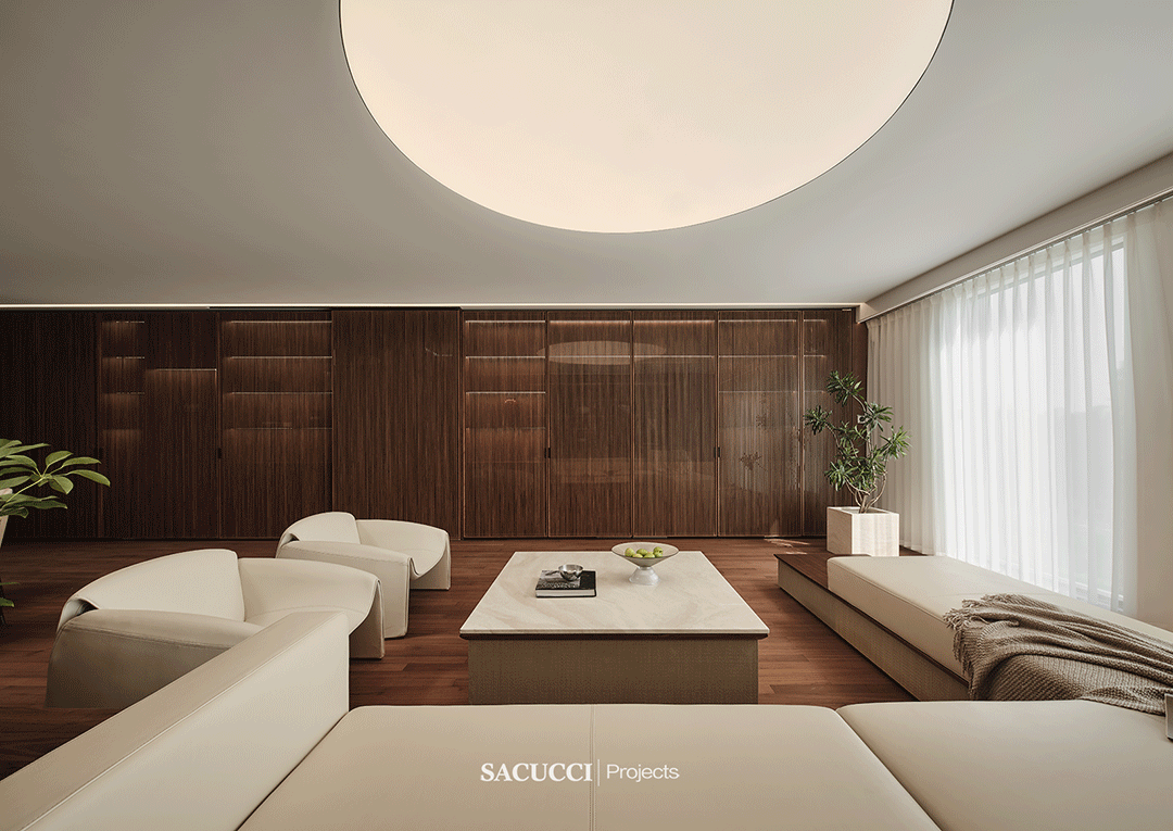 Crossing the warm and quiet bedroom, the gaze turns lightly to the living room, where an alcove behind the sofa quietly unfolds like a secret garden of time, leading us into another elegant realm.