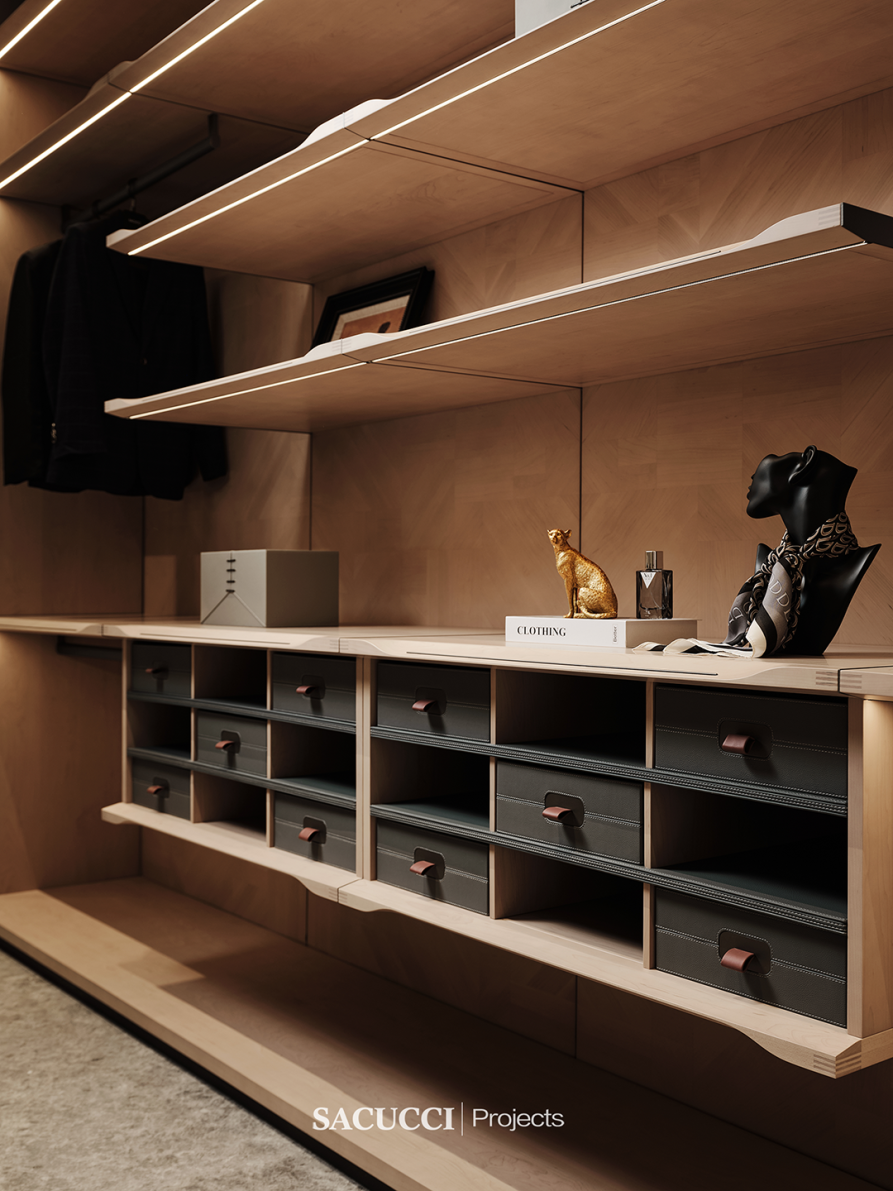 The Sacucci’s Imola walk-in closet elegantly shines in many of our premium cases, serving as a stunning focal point in the home. It embodies spatial aesthetics, with every detail exuding sophistication and taste, like a personal fashion statement that turns every entry into an encounter with elegance and style.