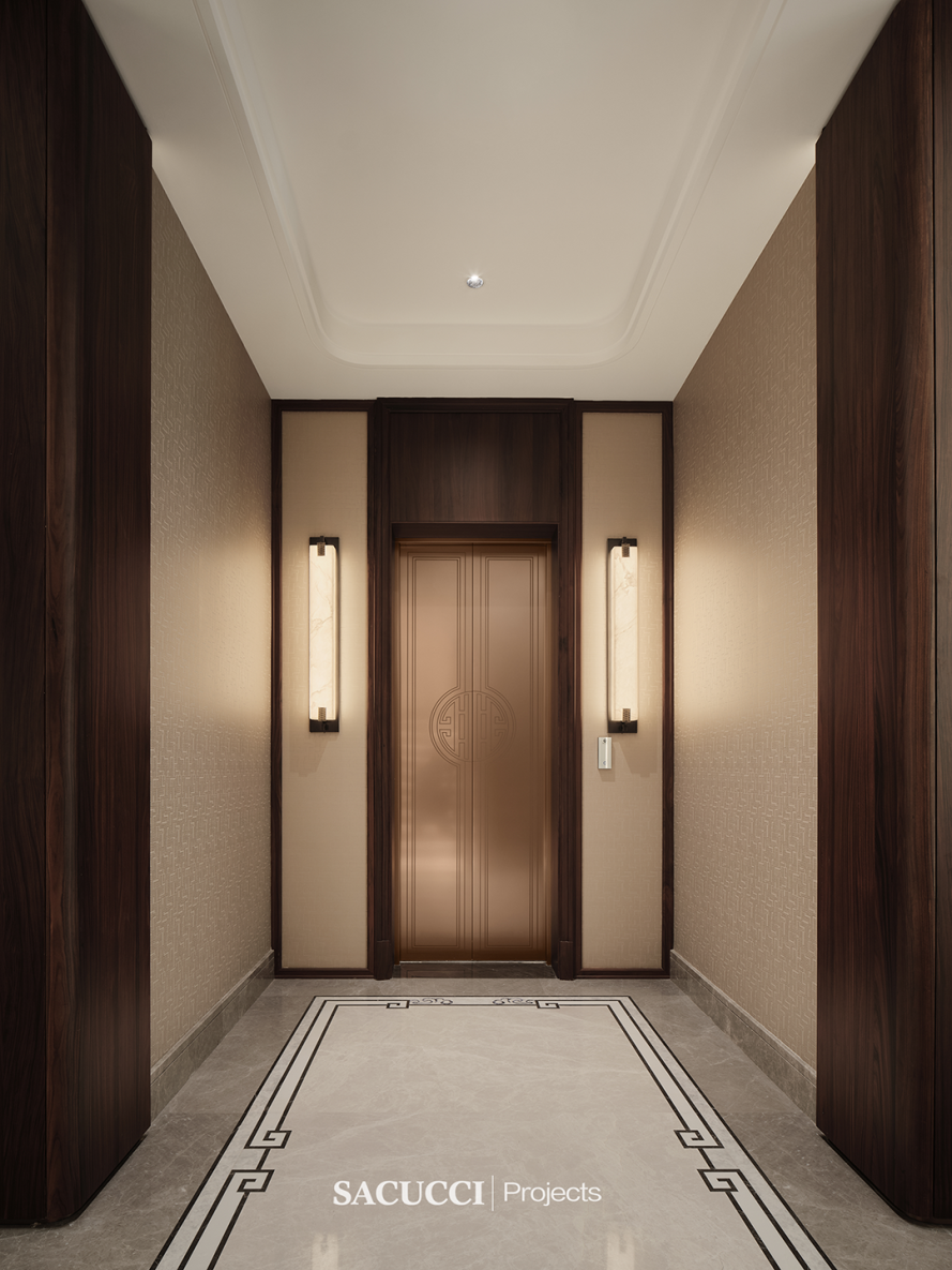 Chinese scenic beauty is known for its endless tenderness and romance. Even in the tiny elevator hall, traditional Chinese elements are cleverly integrated—patterns symbolizing good luck, wall lamps that subtly enhance the atmosphere—making it so that, upon entering the home, you are immediately enveloped in a unique Eastern charm.