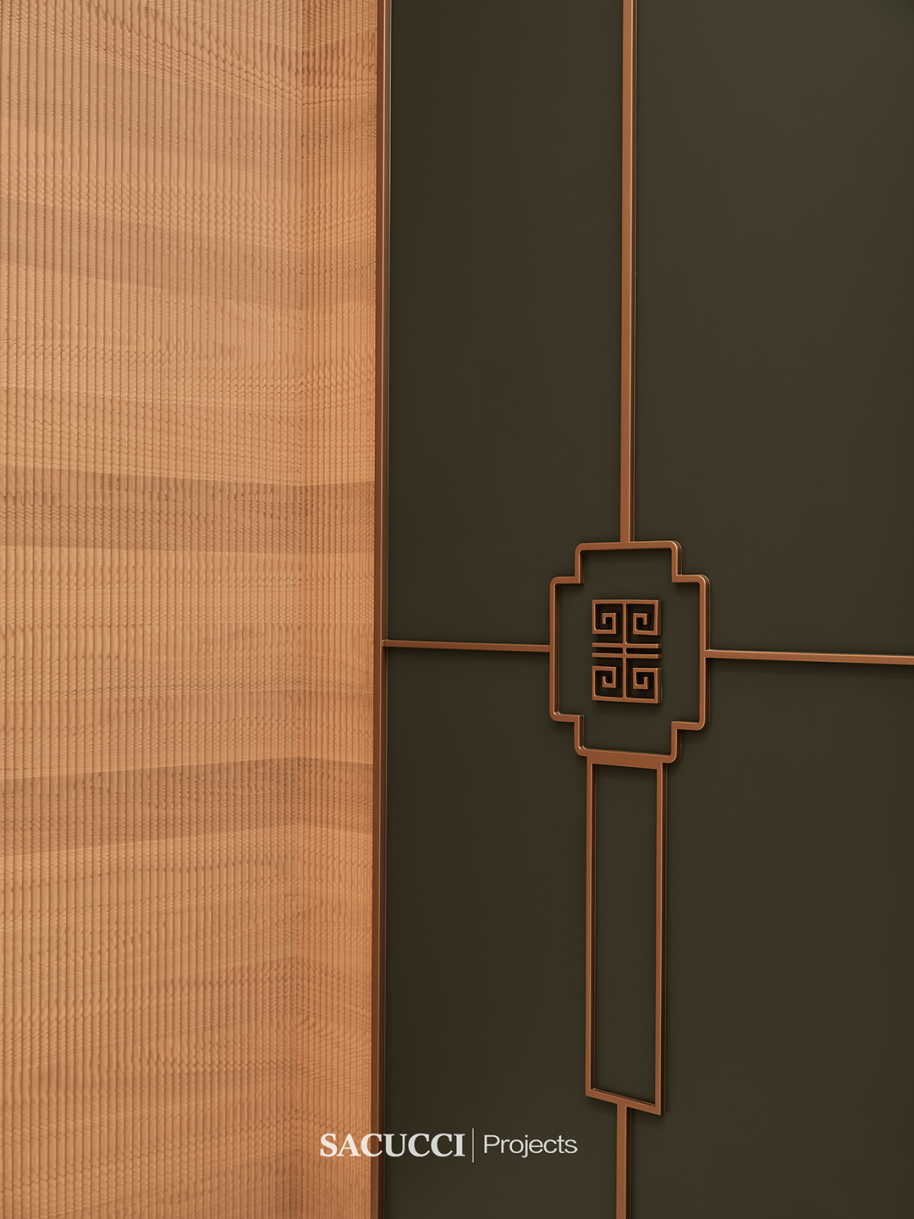 过道护墙以玫瑰木为基底,辅以独特的意式水性漆涂装,表面仿佛被一层轻盈的林间晨雾轻轻笼罩,于光影的微妙折射间,展现出丝绸般的细腻流动质感。深邃的绿色块面,犹如凝固的翡翠,优雅地镶嵌于墙面之上,与暗藏式线性光源交相辉映,共同构筑出一条兼具东方意蕴与现代隐奢美学的艺术长廊。